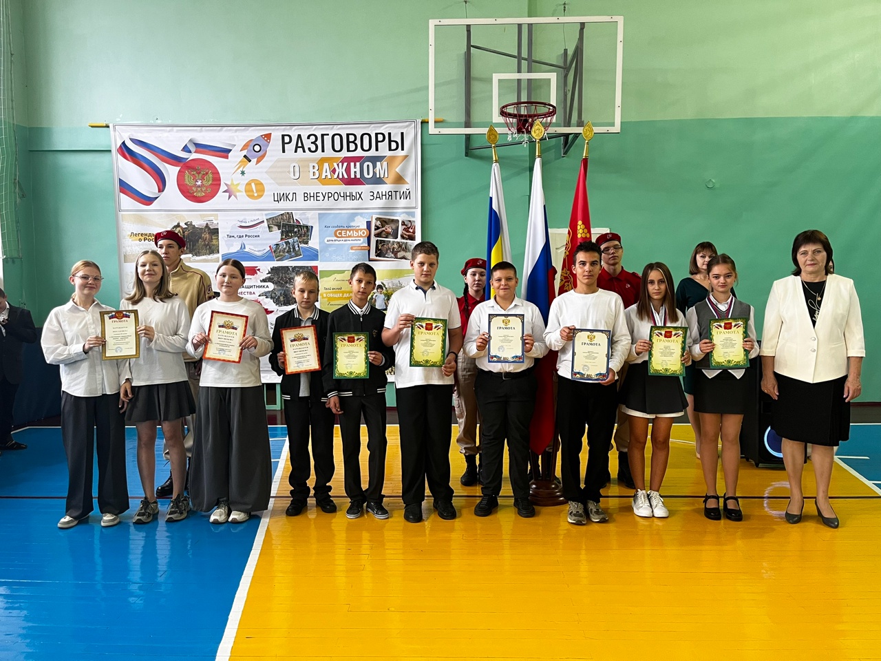 6 октября традиционно была проведена общешкольная линейка, на которой были внесены флаги и исполнен гимн Российской Федерации.