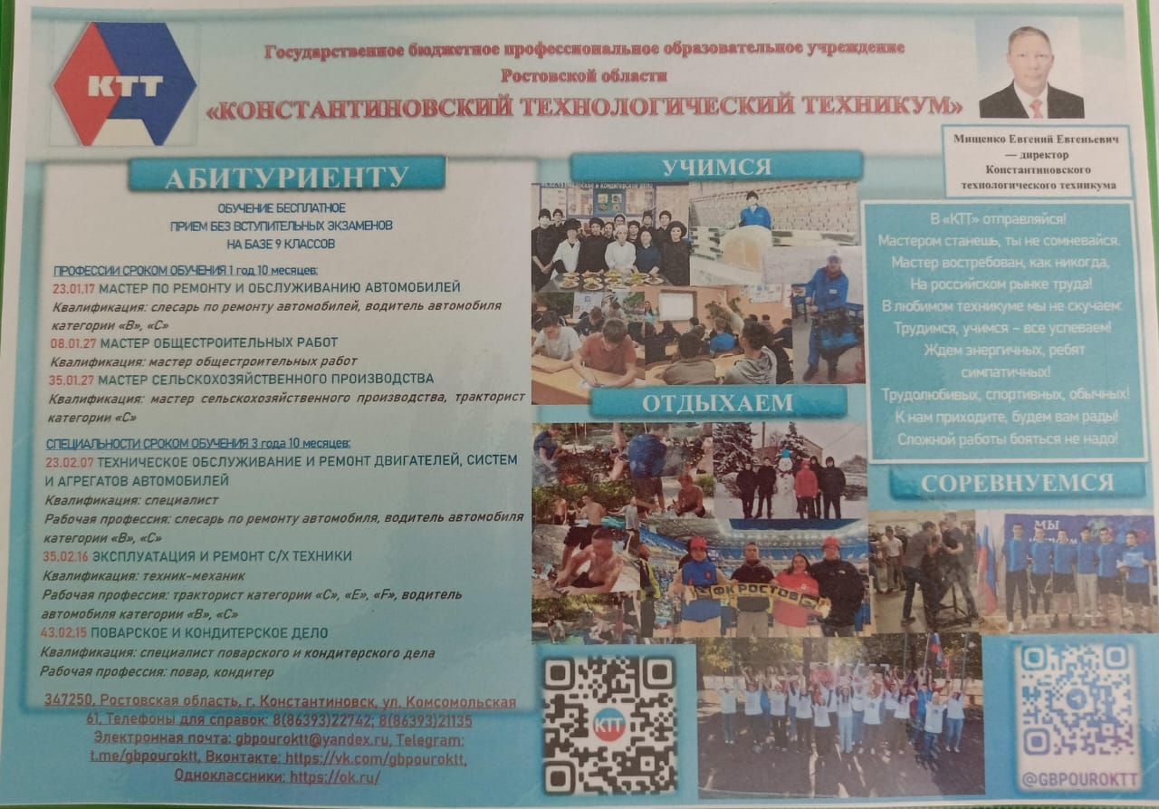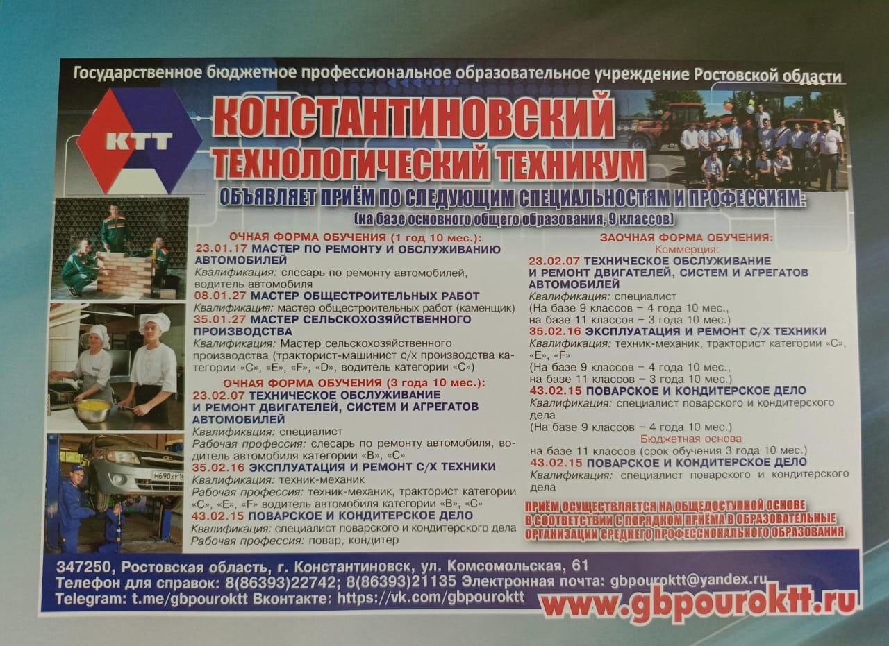 13 марта для учащихся 9 классов МБОУ УДСОШ № 2, состоялась профориентационная встреча с представителями Государственного бюджетного профессионального образовательного учреждения Ростовской области «Константиновский технологический техникум», которые рассказали выпускникам, о всех бонусах при поступлении в их техникум и дополнительных программах для детей из семей льготной категории и многодетных.